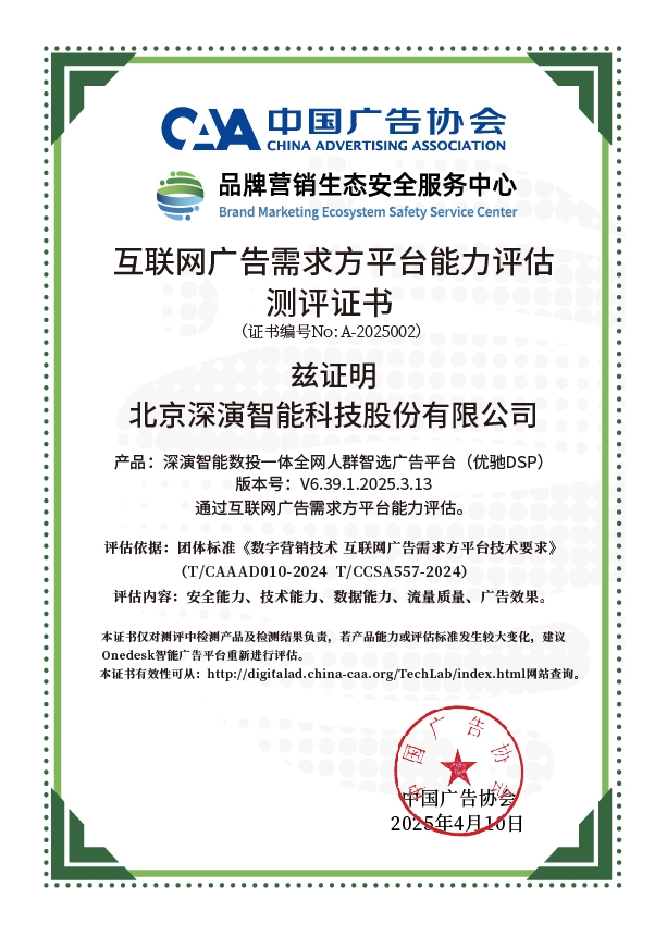 4月10日,中国广告协会发布「互联网广告需求方平台能力评估」测评结果。Martech领域领军企业z6mg·人生就是博旗下产品z6mg·人生就是博数投一体全网人群智选广告平台(优驰 DSP),凭借其在智能算法优化、技术创新、数据安全治理及流量质量管控等维度的突出表现,高分通过该项行业权威测评,获颁中国广告协会评估证书,成为业内首批通过认证的标杆企业。